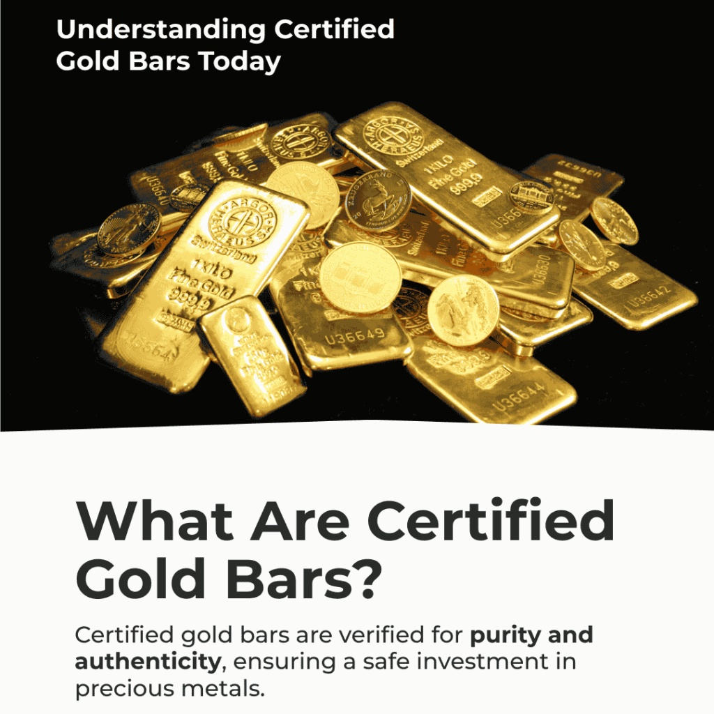 Certified gold bars are physical gold bars that come with an official certificate of authenticity verifying: